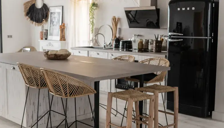 Când vine vorba de mobilier, texturile primare sunt clar în tendințe! Lemnul continuă să fie preferatul stilului etnic datorită aspectului său natural. Unele specii sunt în mod special apreciate pentru varietatea de culori și fibra diferită, oferind impresia că obiectul a fost sculptat dintr-o bucată de scoarță. În mod similar, răchita, nuielele sau alte fibre vegetale necolorate pot fi folosite la fotolii sau ca suporturi pentru ghivece. Totuși, un interior etnic nu ar fi complet fără o notă metalică. Fie că este vorba de un raft sau de capătul unei canapele, este suficientă o singură atingere de metal închis pentru ca să fi resimțit caracterul puternic al acestui interior exotic.